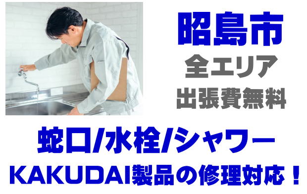 昭島市で水栓メーカーKAKUDAIの修理業者をお探しなら当社までお気軽にお問い合わせください。蛇口の水漏れ、シャワーの故障などカクダイ製に関するトラブルなら何でもご相談ください。