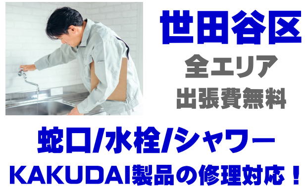 世田谷区で水栓メーカーKAKUDAIの修理業者をお探しなら当社までお気軽にお問い合わせください。蛇口の水漏れ、シャワーの故障などカクダイ製に関するトラブルなら何でもご相談ください。
